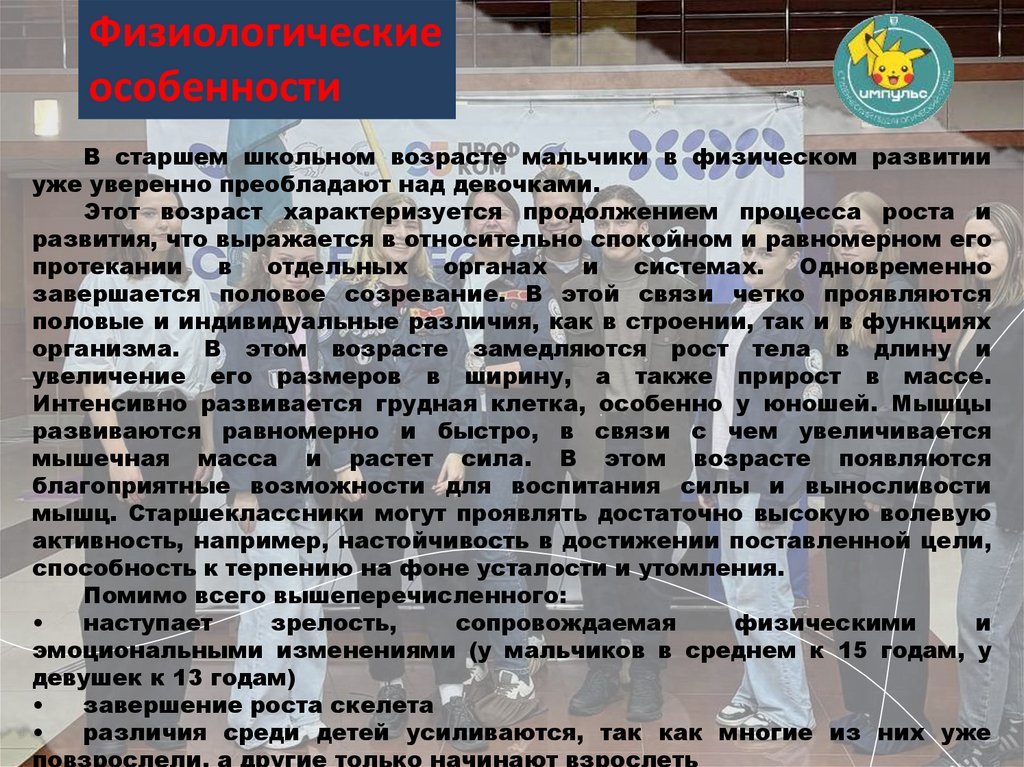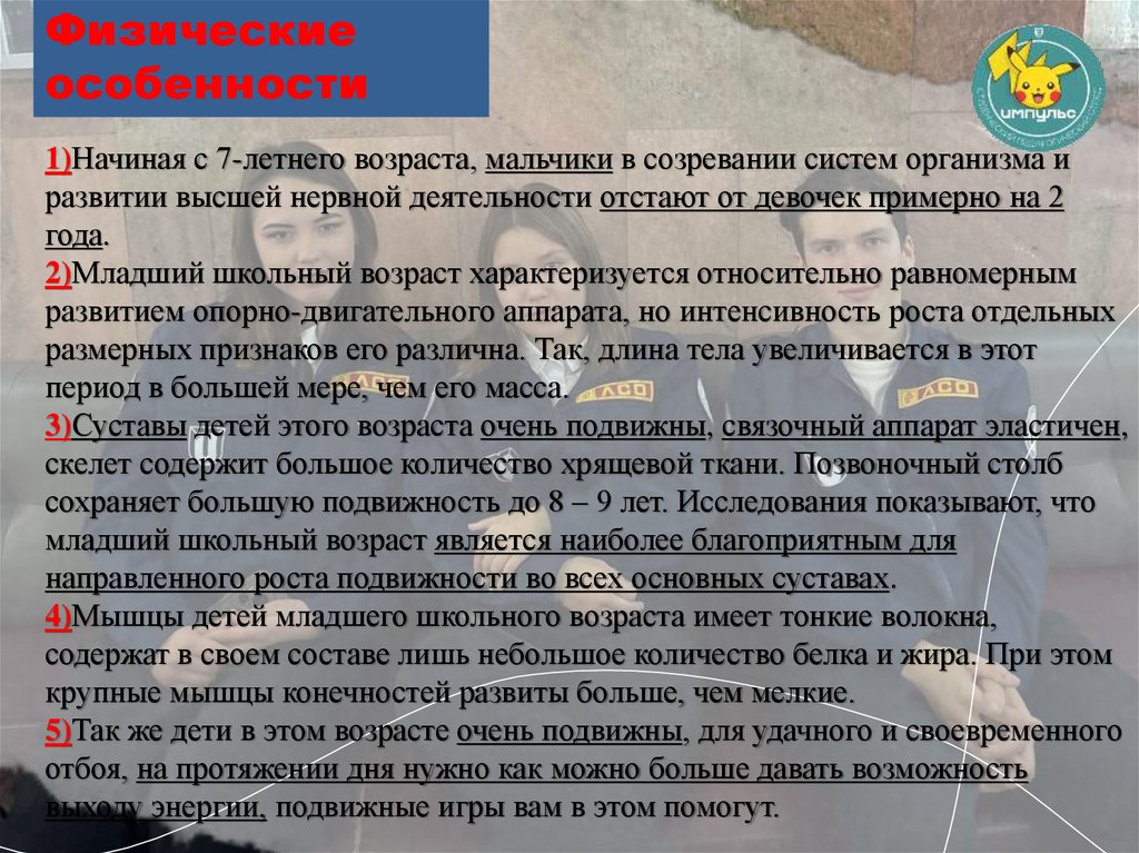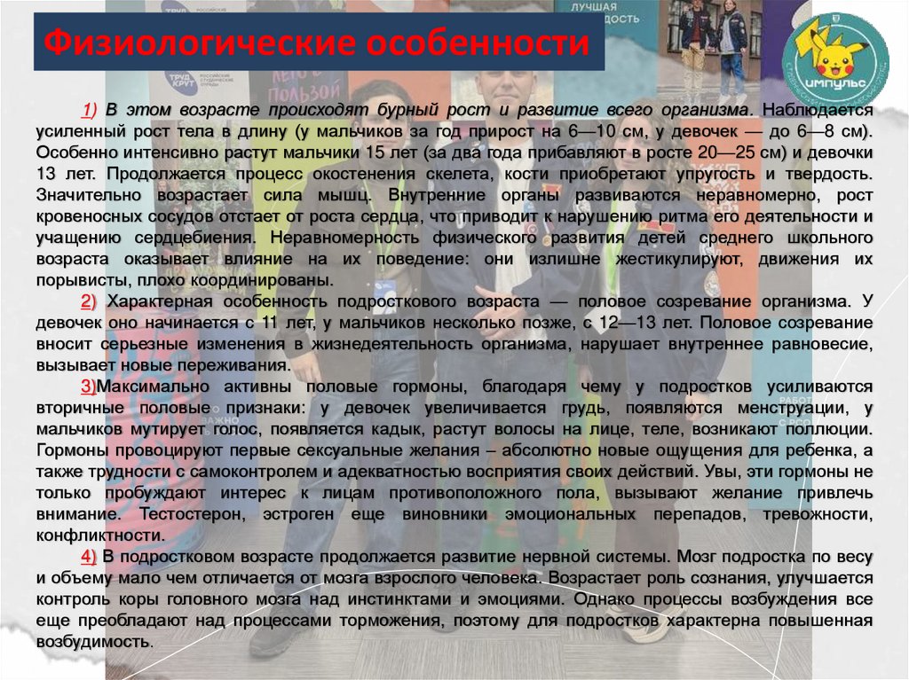 Физиологические особенности1) В этом возрасте происходят бурный рост и развитие всего организма. Наблюдается