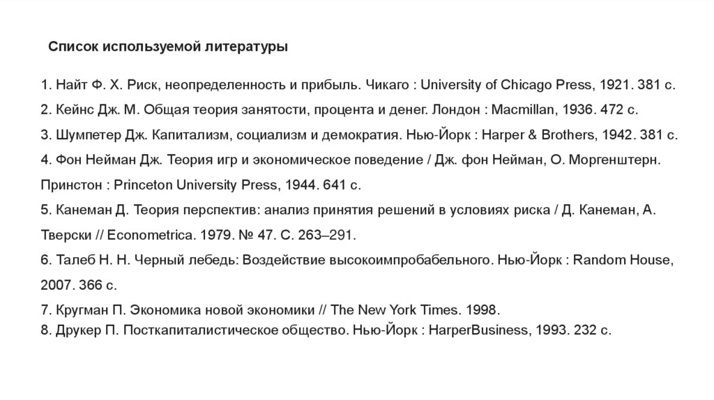 Список используемой литературы1. Найт Ф. Х. Риск, неопределенность и прибыль. Чикаго : University of Chicago Press, 1921. 381 с.