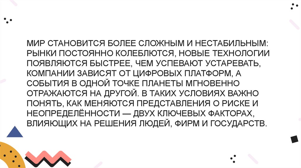 МИР СТАНОВИТСЯ БОЛЕЕ СЛОЖНЫМ И НЕСТАБИЛЬНЫМ:РЫНКИ ПОСТОЯННО КОЛЕБЛЮТСЯ, НОВЫЕ ТЕХНОЛОГИИ