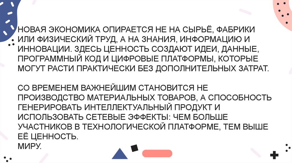 НОВАЯ ЭКОНОМИКА ОПИРАЕТСЯ НЕ НА СЫРЬЁ, ФАБРИКИИЛИ ФИЗИЧЕСКИЙ ТРУД, А НА ЗНАНИЯ, ИНФОРМАЦИЮ И