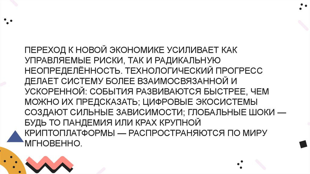 ПЕРЕХОД К НОВОЙ ЭКОНОМИКЕ УСИЛИВАЕТ КАКУПРАВЛЯЕМЫЕ РИСКИ, ТАК И РАДИКАЛЬНУЮ