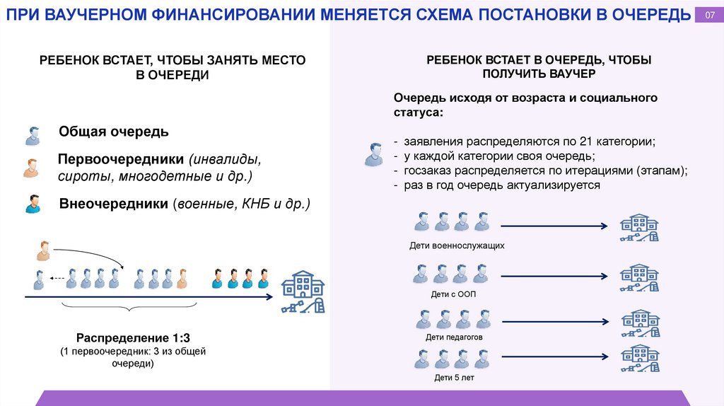 1) коренным образом меняется постановка в очередь, теперь ребенок стоит в очереди за «деньгами» и идет справедливое распределение