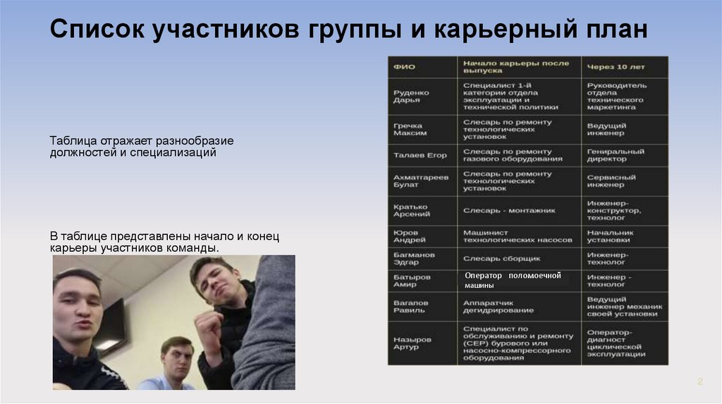 Список участников группы и карьерный планТаблица отражает разнообразие