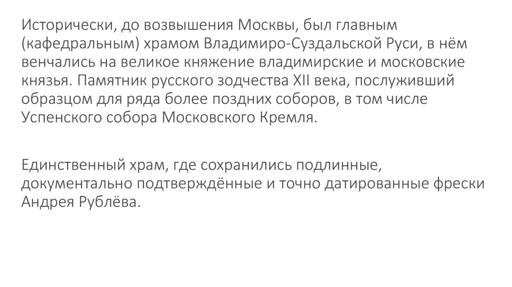 Исторически, до возвышения Москвы, был главным(кафедральным) храмом Владимиро-Суздальской Руси, в нём