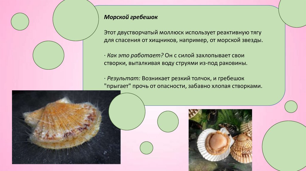 Морской гребешокЭтот двустворчатый моллюск использует реактивную тягу