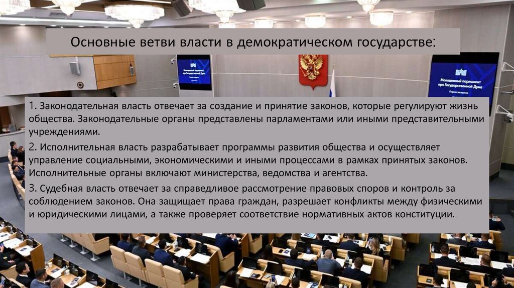Основные ветви власти в демократическом государстве:1. Законодательная власть отвечает за создание и принятие законов, которые регулируют жизнь