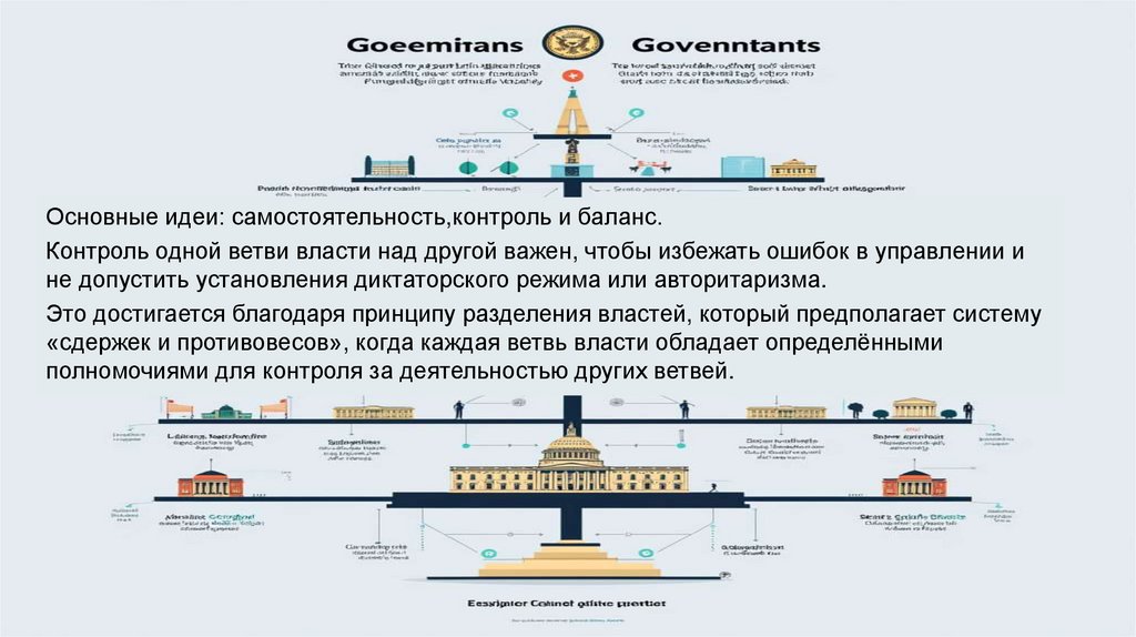 Основные идеи: самостоятельность,контроль и баланс.Контроль одной ветви власти над другой важен, чтобы избежать ошибок в управлении и