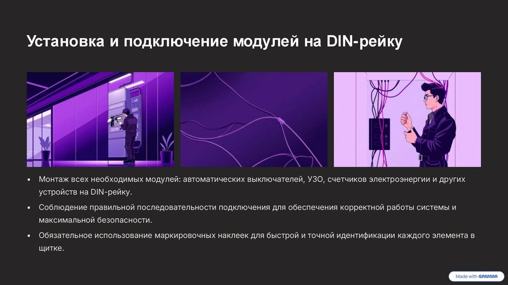 Установка и подключение модулей на DIN-рейку• Монтаж всех необходимых модулей: автоматических выключателей, УЗО, счетчиков электроэнергии и других