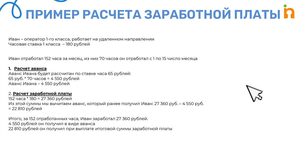 ПРИМЕР РАСЧЕТА ЗАРАБОТНОЙ ПЛАТЫИван – оператор 1-го класса, работает на удаленном направлении