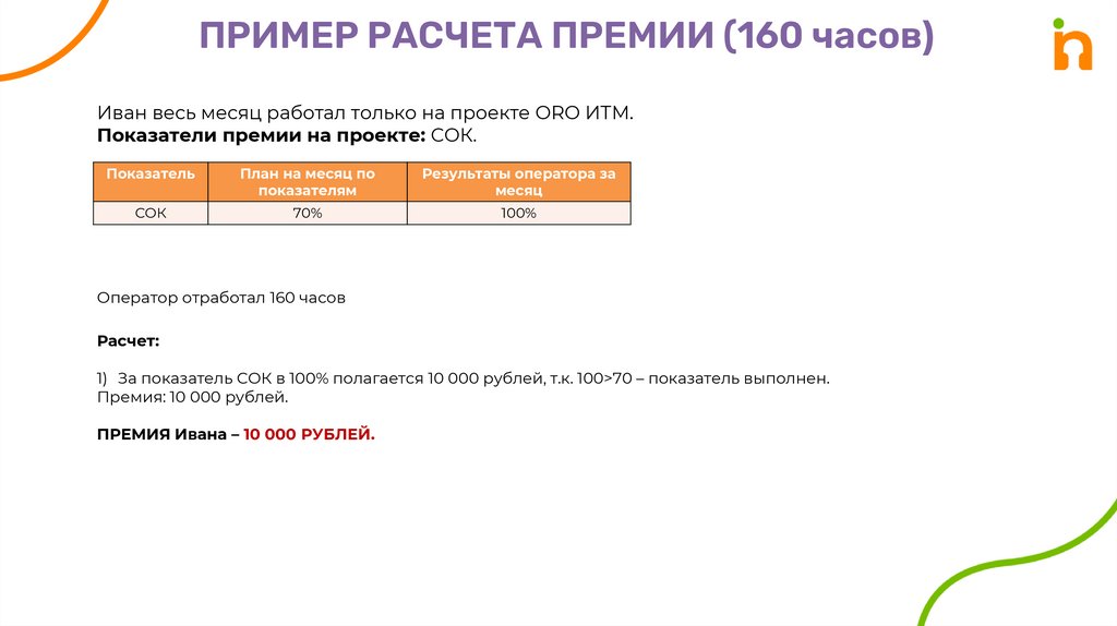 ПРИМЕР РАСЧЕТА ПРЕМИИ (160 часов)Иван весь месяц работал только на проекте ORO ИТМ.