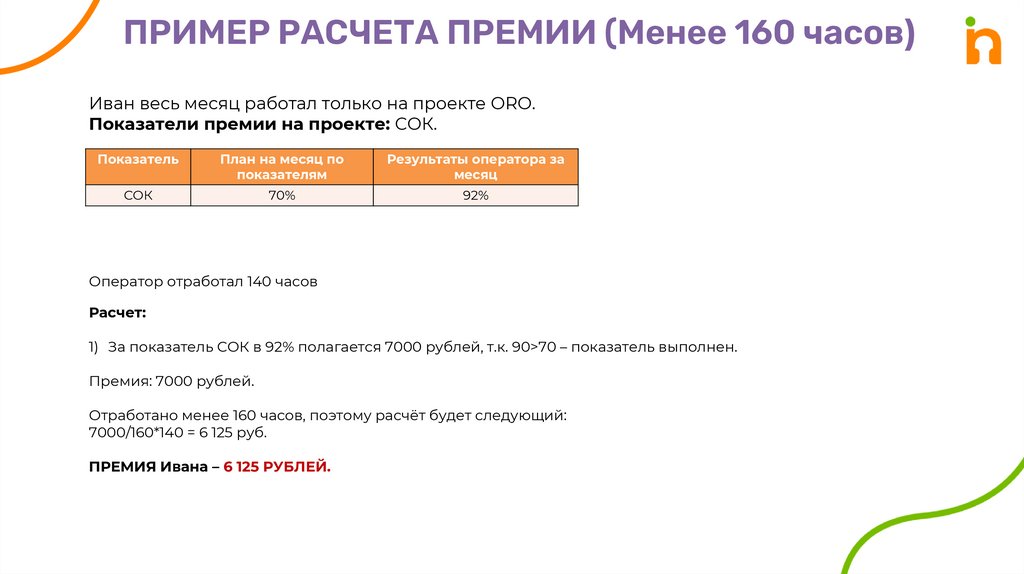 ПРИМЕР РАСЧЕТА ПРЕМИИ (Менее 160 часов)Иван весь месяц работал только на проекте ORO.
