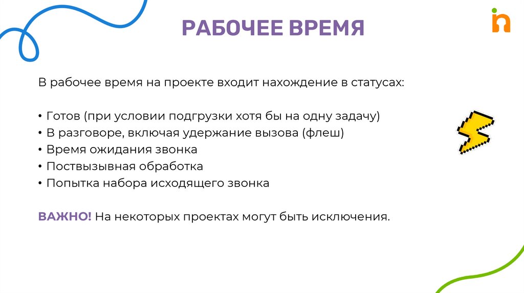В рабочее время на проекте входит нахождение в статусах: