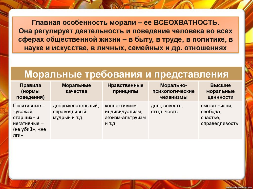 Главная особенность морали – ее ВСЕОХВАТНОСТЬ.Она регулирует деятельность и поведение человека во всех