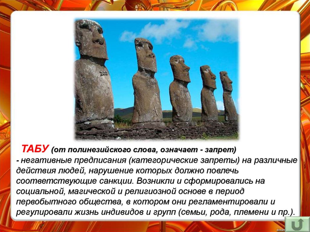 ТАБУ (от полинезийского слова, означает - запрет)- негативные предписания (категорические запреты) на различные