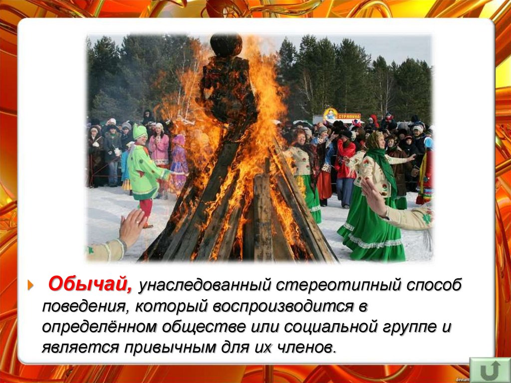 Обычай, унаследованный стереотипный способповедения, который воспроизводится в
