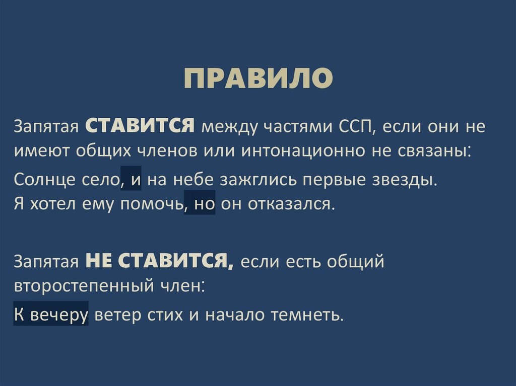 ПРАВИЛОЗапятая СТАВИТСЯ между частями ССП, если они не
