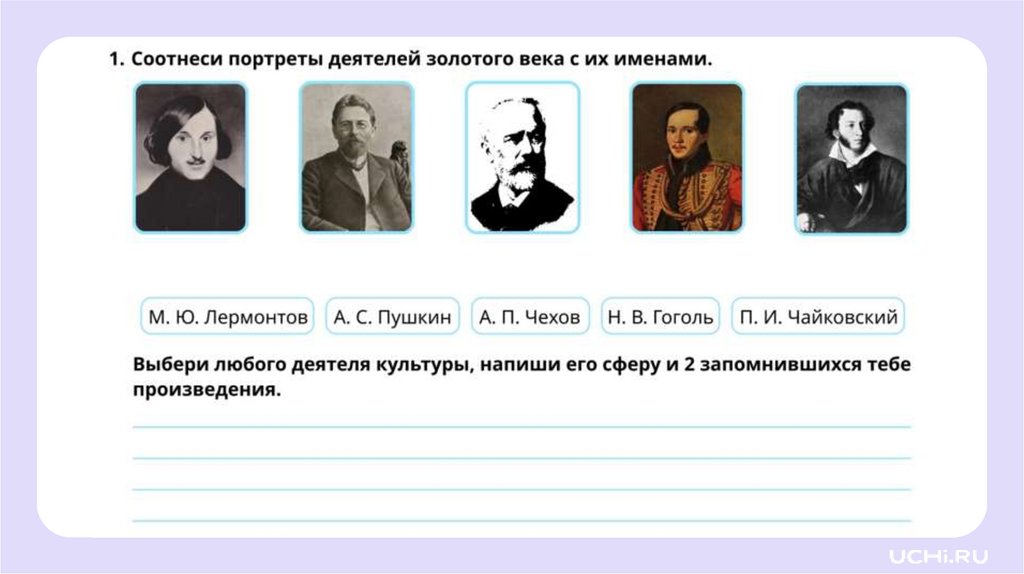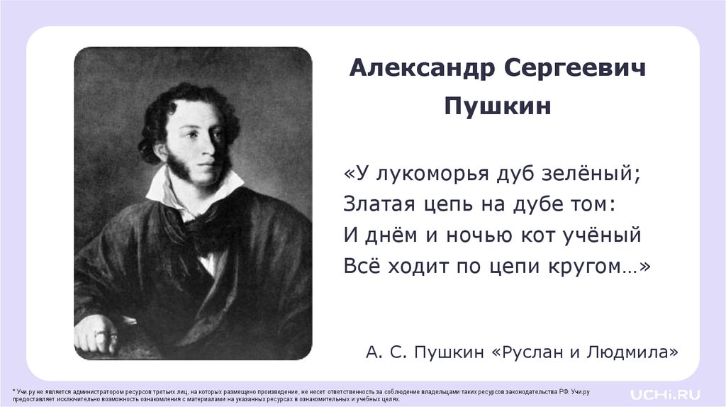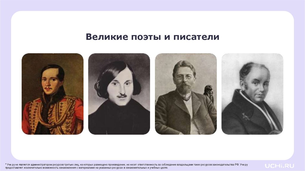 Великие поэты и писатели* Учи.ру не является администратором ресурсов третьих лиц, на которых размещено произведение, не несет ответственность за соблюдение владельцами таких ресурсов законодательства РФ. Учи.ру