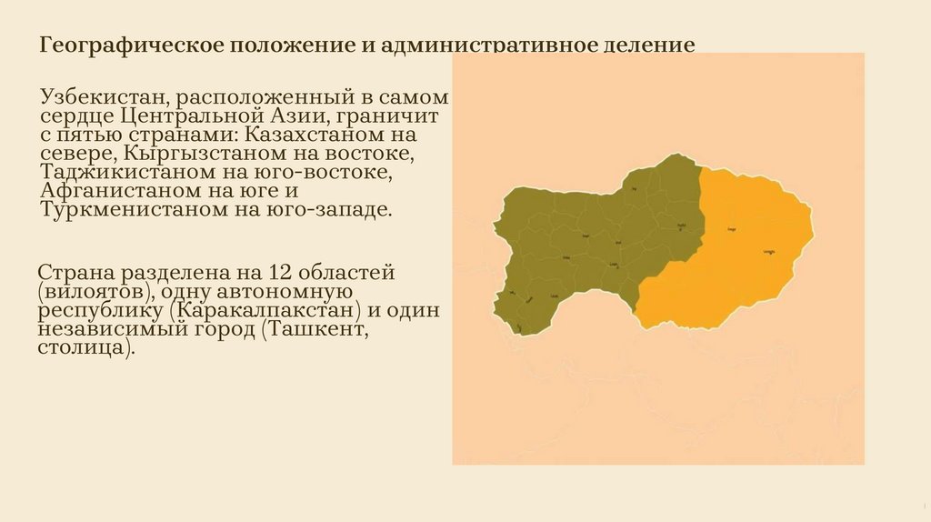Географическое положение и административное делениеУзбекистан, расположенный в самом