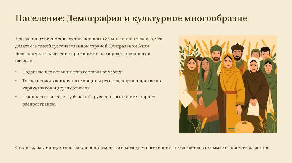 Население: Демография и культурное многообразиеНаселение Узбекистана составляет около 35 миллионов человек, что