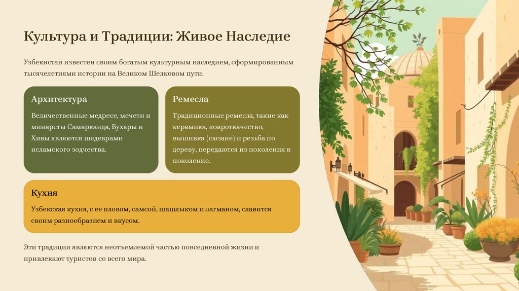 Культура и Традиции: Живое НаследиеУзбекистан известен своим богатым культурным наследием, сформированным