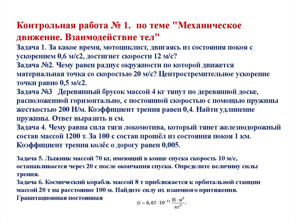 Контрольная работа № 1. по теме "Механическоедвижение. Взаимодействие тел"