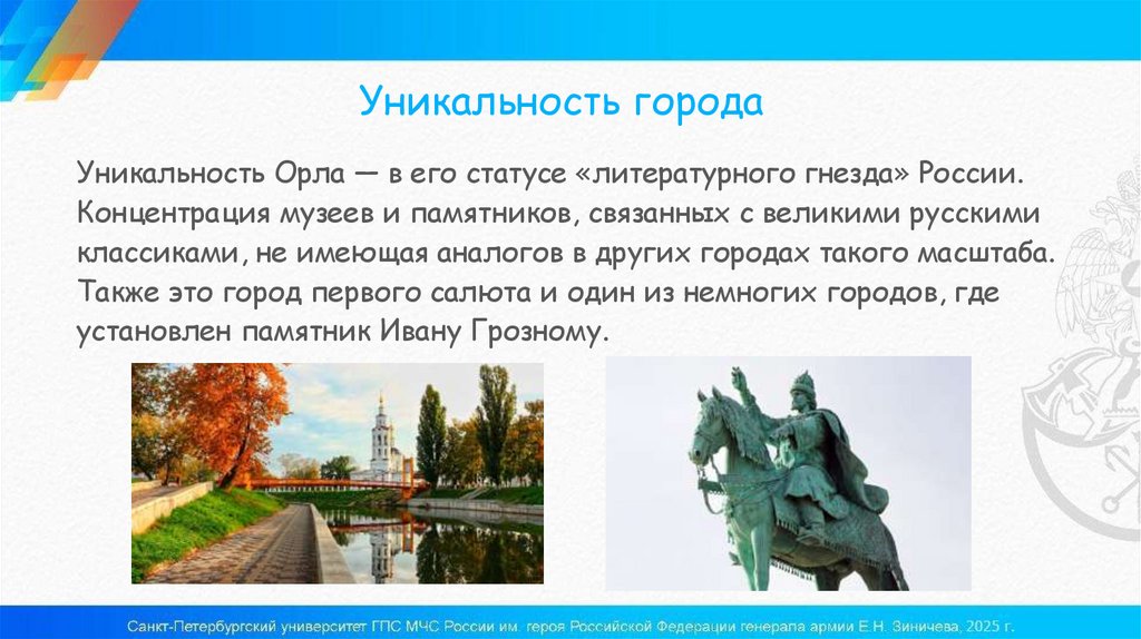 Уникальность городаУникальность Орла — в его статусе «литературного гнезда» России.
