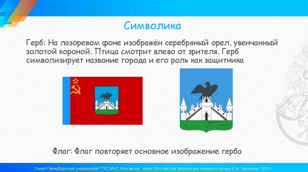 СимволикаГерб: На лазоревом фоне изображён серебряный орел, увенчанный