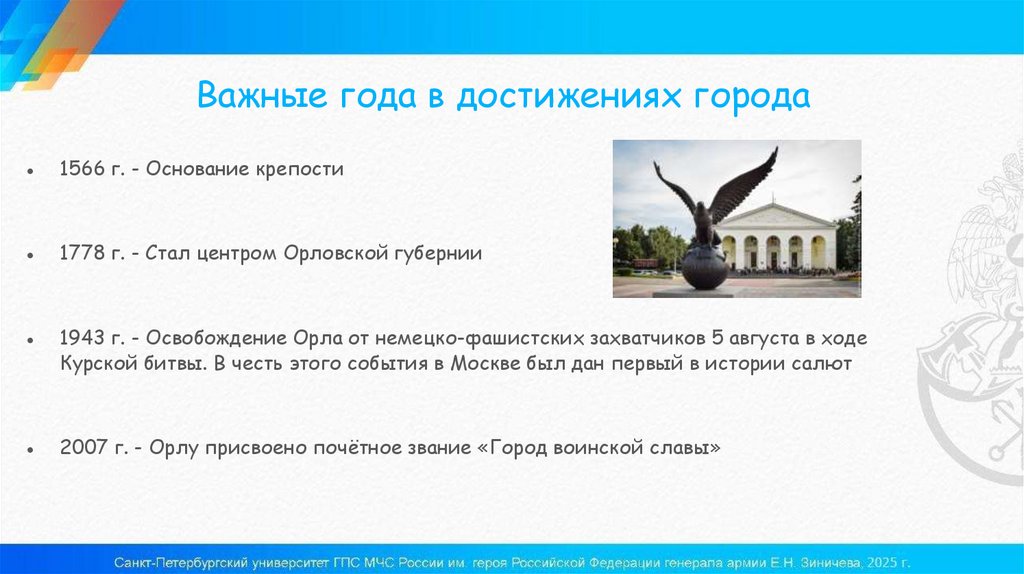 2007 г. - Орлу присвоено почётное звание «Город воинской славы»