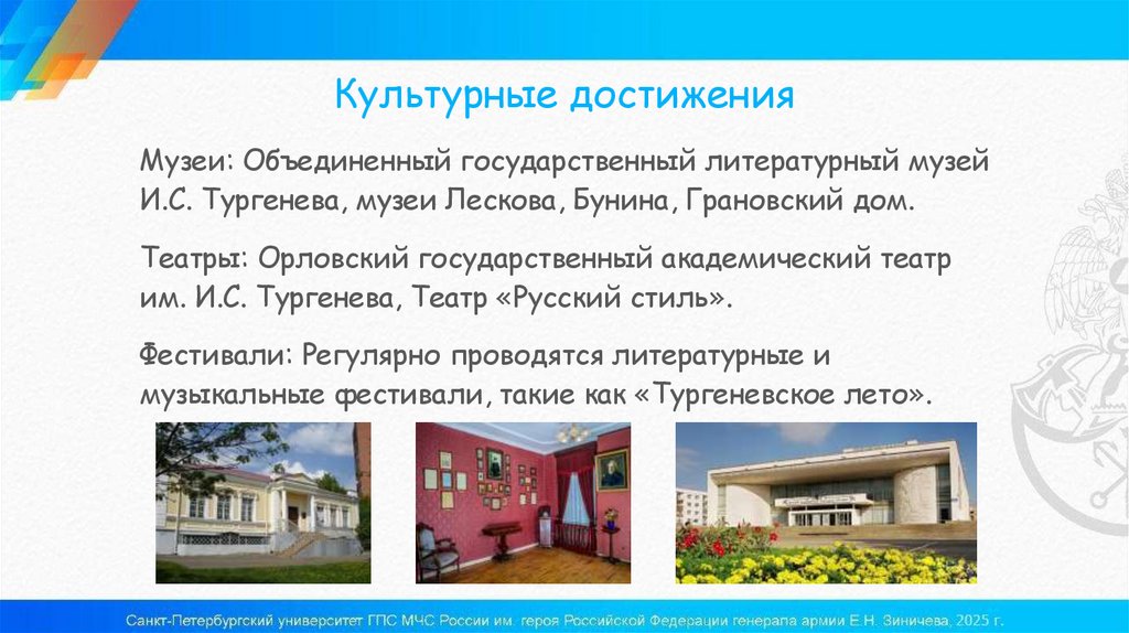 И.С. Тургенева, музеи Лескова, Бунина, Грановский дом.