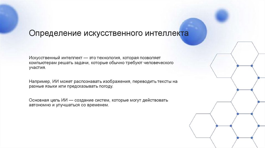 Определение искусственного интеллектаИскусственный интеллект — это технология, которая позволяет
