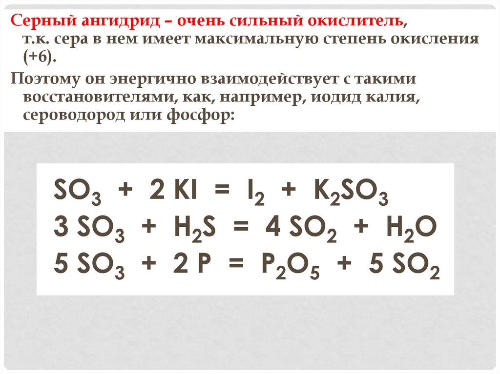 Серный ангидрид – очень сильный окислитель,т.к. сера в нем имеет максимальную степень окисления