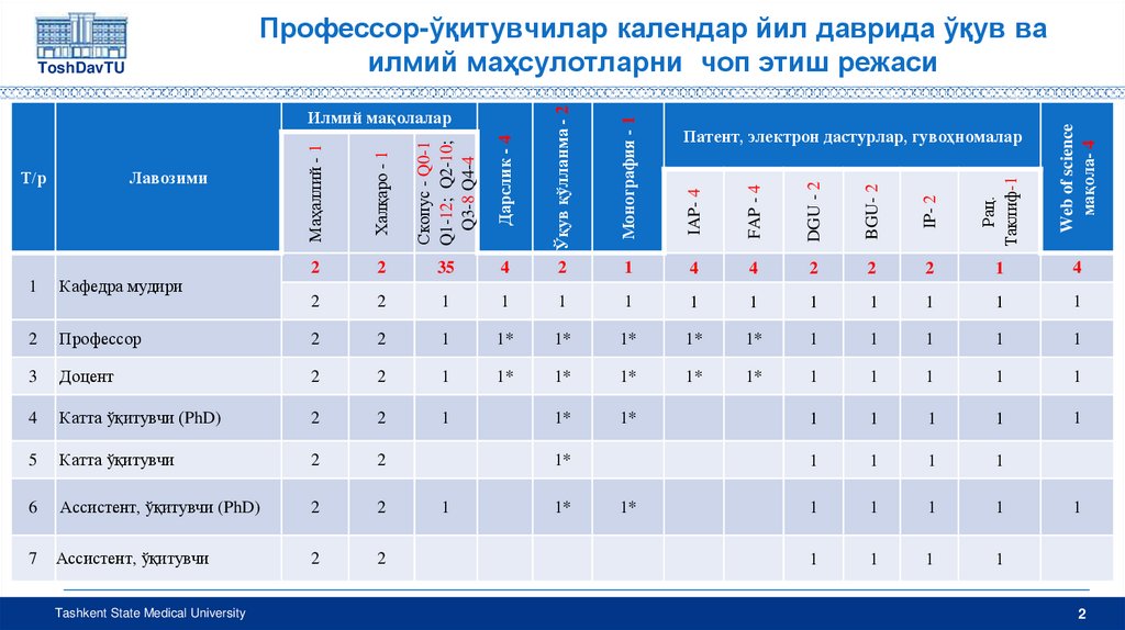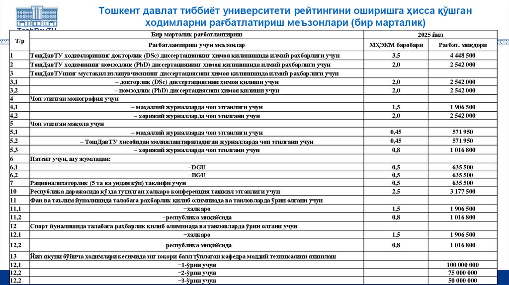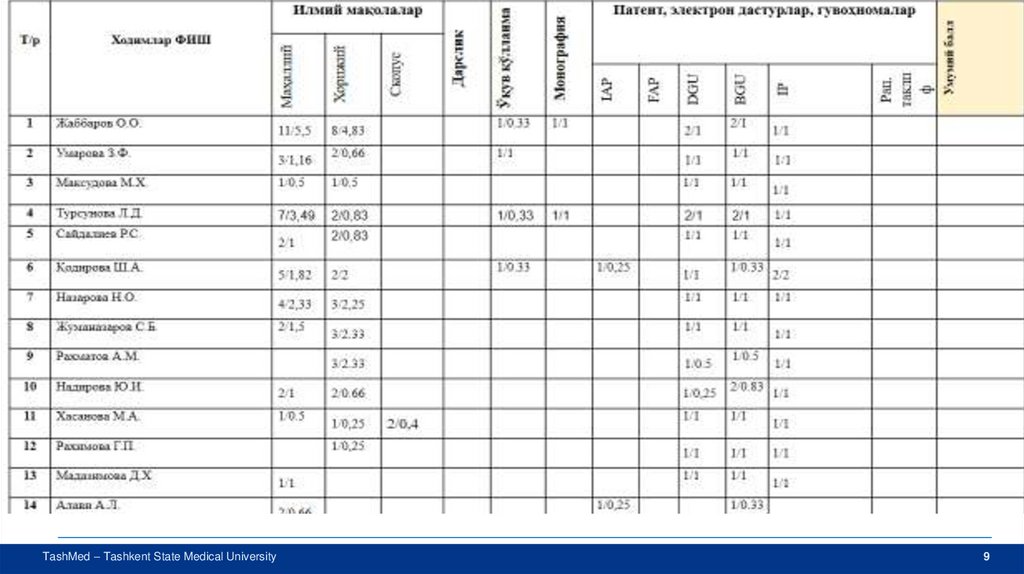 ТОШКЕНТ ДАВЛАТ ТИББИЁТ УНИВЕРСИТЕТИкафедраларнинг рейтинг кўрсаткичлари