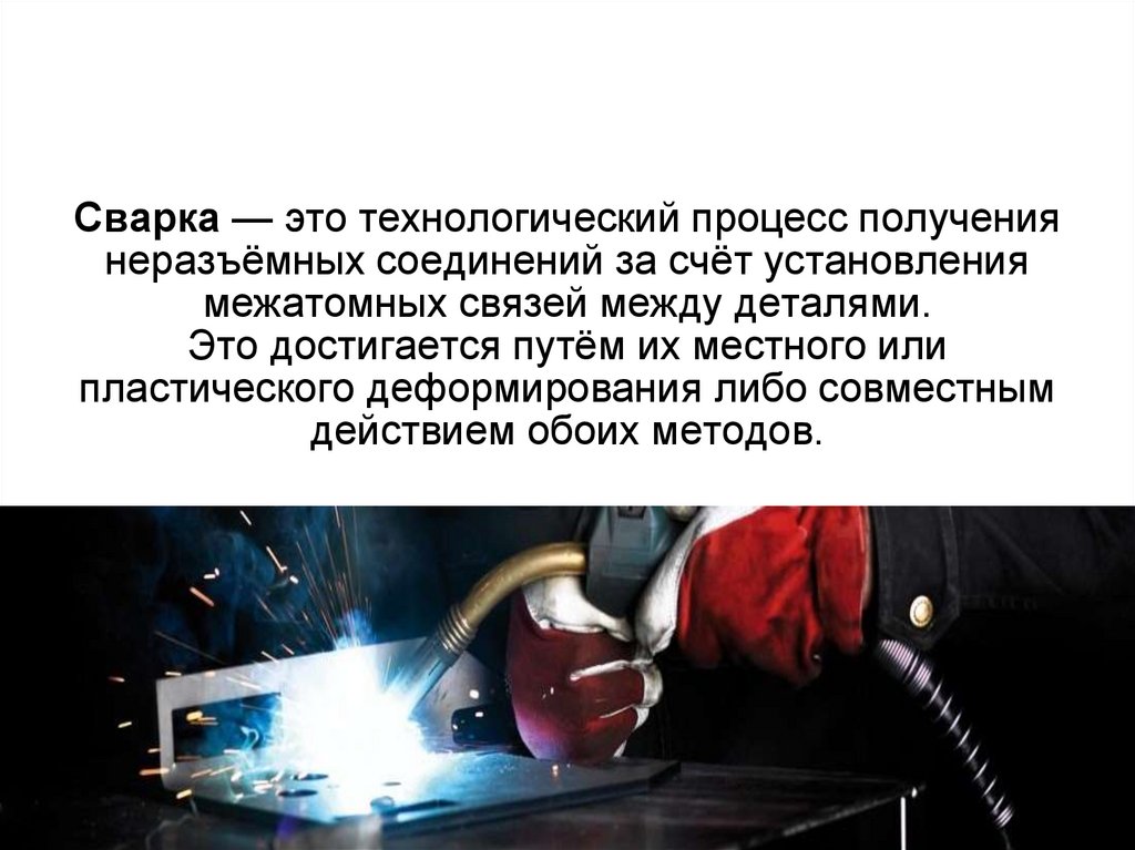 Сварка — это технологический процесс получениянеразъёмных соединений за счёт установления