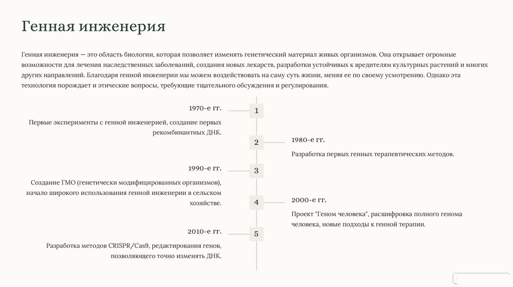 Генная инженерияГенная инженерия — это область биологии, которая позволяет изменять генетический материал живых организмов. Она открывает огромные