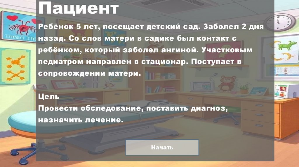 ПациентРебёнок 5 лет, посещает детский сад. Заболел 2 дня