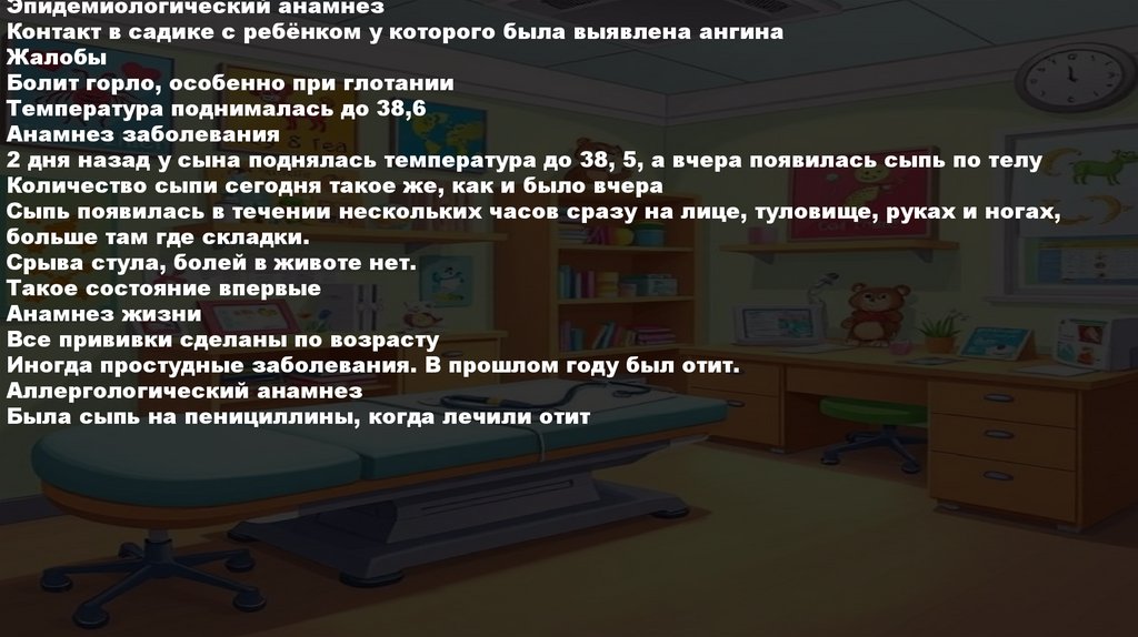 Эпидемиологический анамнезКонтакт в садике с ребёнком у которого была выявлена ангина