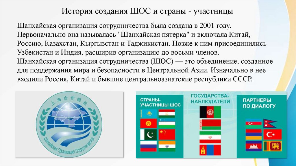 История создания ШОС и страны - участницыШанхайская организация сотрудничества была создана в 2001 году.