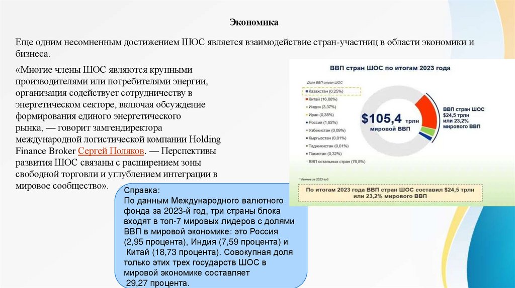•ВВП стран ШОС — 23 триллиона долларов, это четверть мирового ВВП.