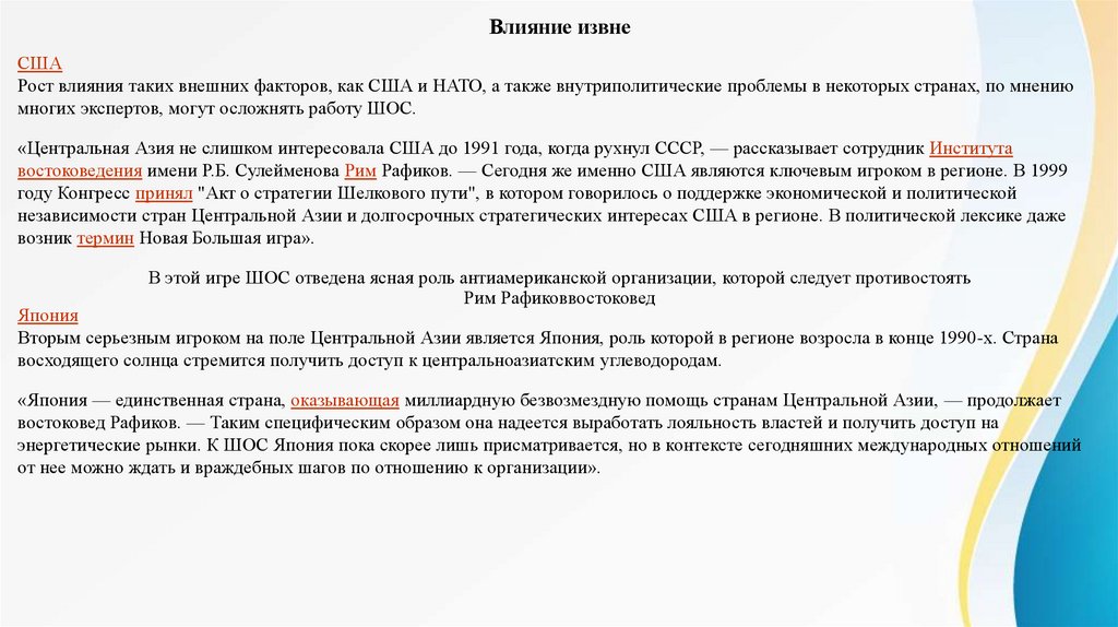 востоковедения имени Р.Б. Сулейменова Рим Рафиков. — Сегодня же именно США являются ключевым игроком в регионе. В 1999