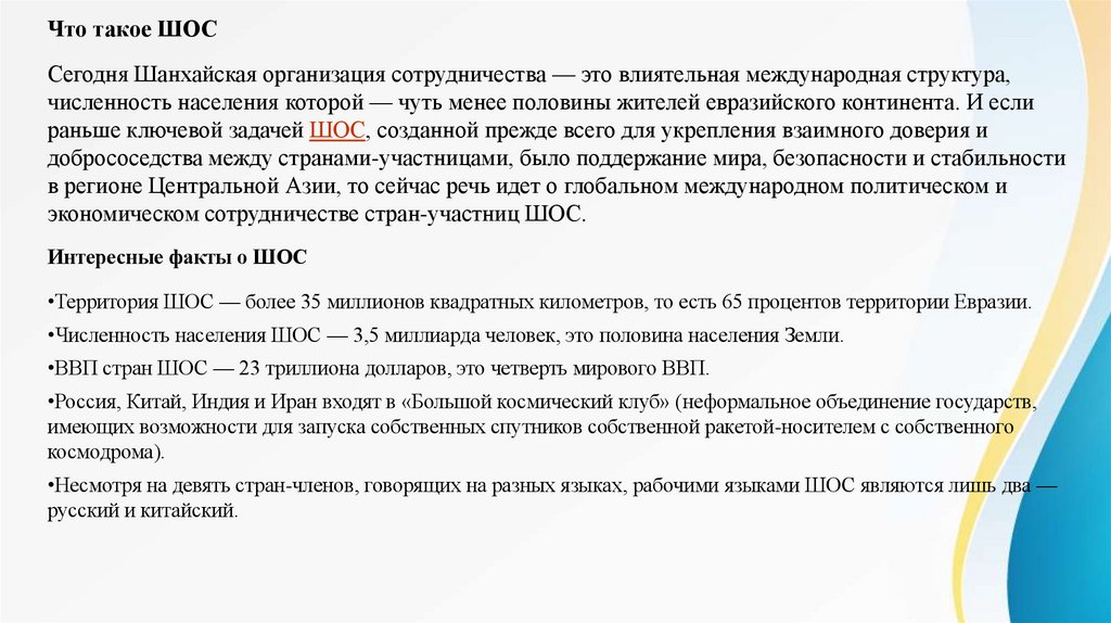 •Территория ШОС — более 35 миллионов квадратных километров, то есть 65 процентов территории Евразии.