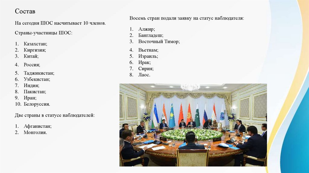 СоставНа сегодня ШОС насчитывает 10 членов.