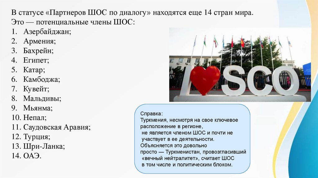 В статусе «Партнеров ШОС по диалогу» находятся еще 14 стран мира.Это — потенциальные члены ШОС:
