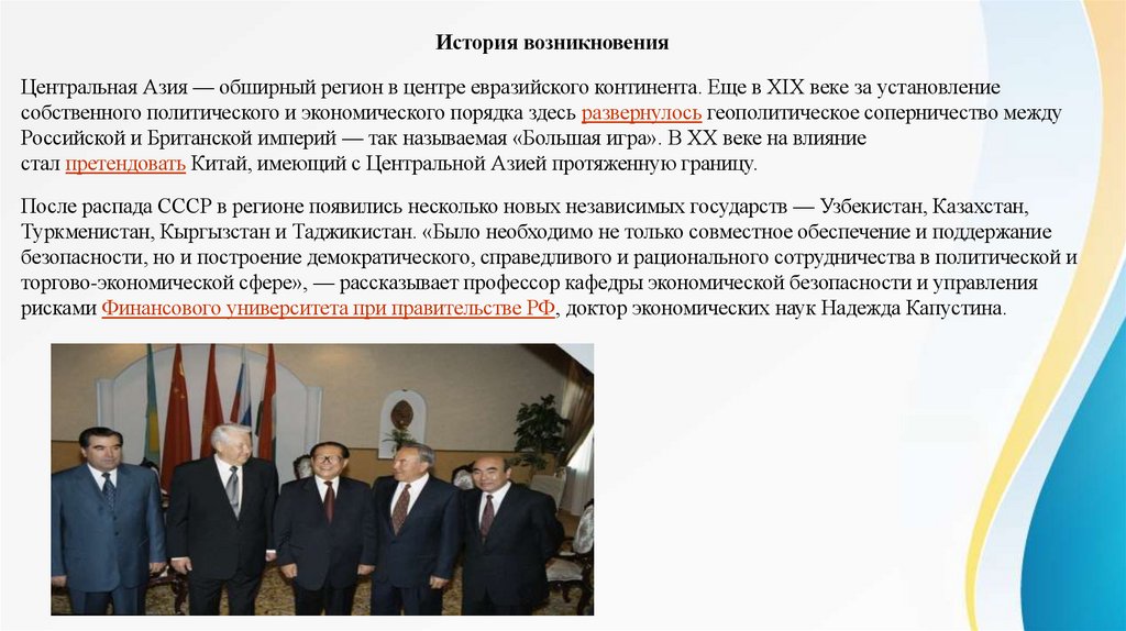 История возникновенияЦентральная Азия — обширный регион в центре евразийского континента. Еще в XIX веке за установление