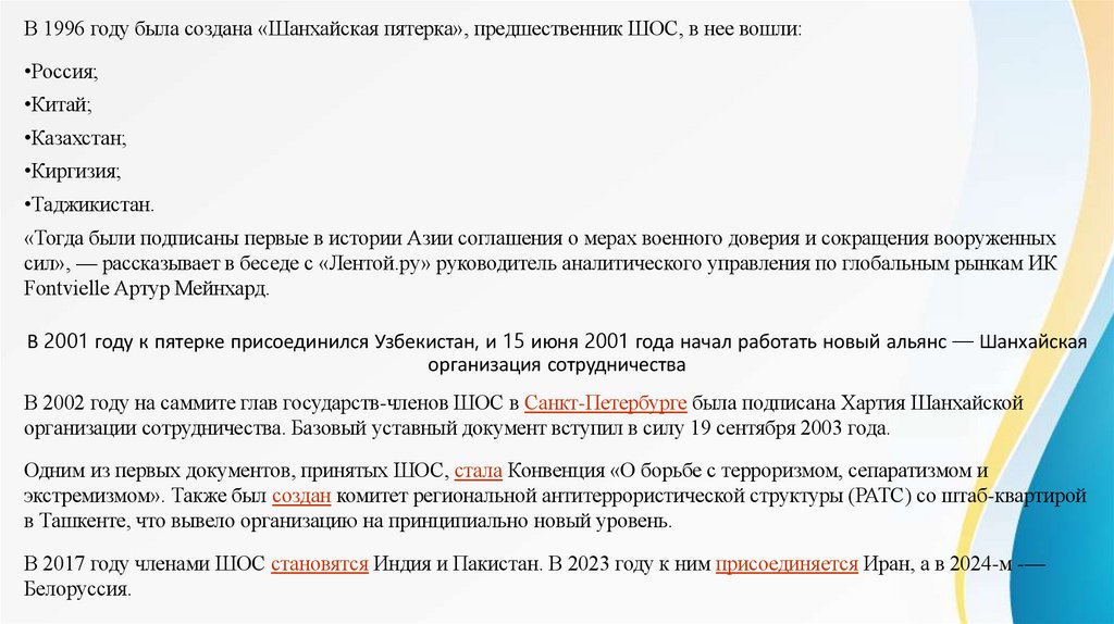 В 1996 году была создана «Шанхайская пятерка», предшественник ШОС, в нее вошли:•Россия;
