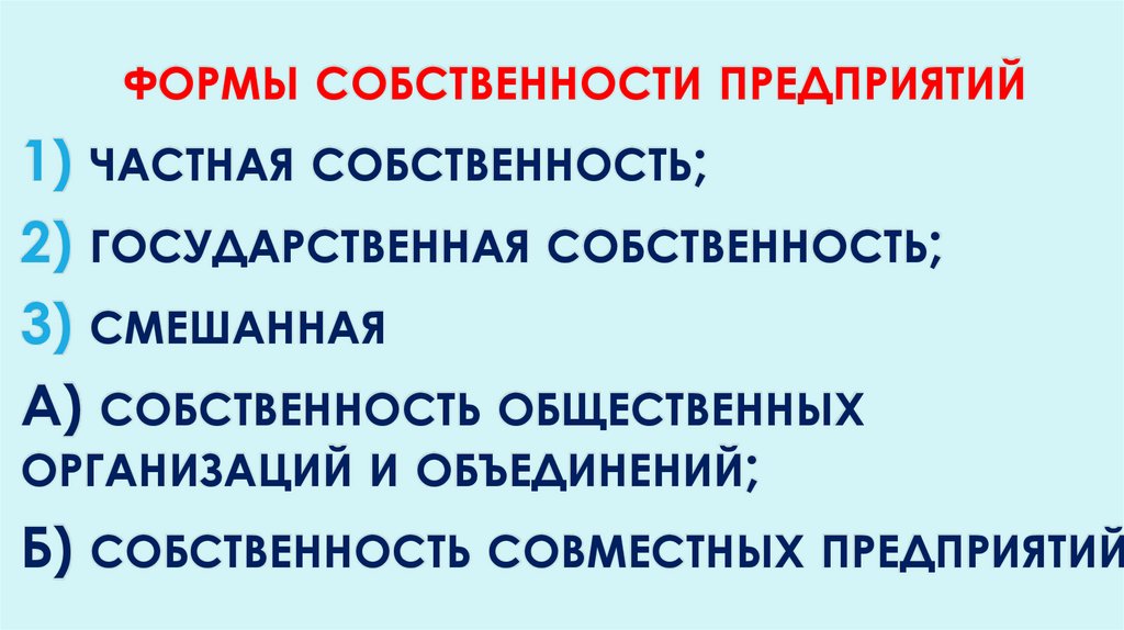 ФОРМЫ СОБСТВЕННОСТИ ПРЕДПРИЯТИЙ1) ЧАСТНАЯ СОБСТВЕННОСТЬ;