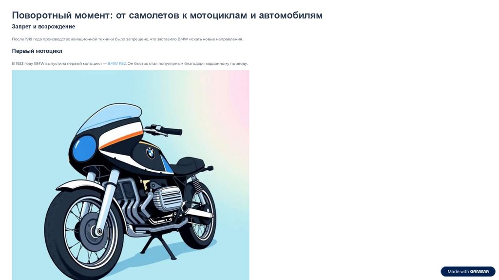 В 1923 году BMW выпустила первый мотоцикл — BMW R32. Он быстро стал популярным благодаря карданному приводу.