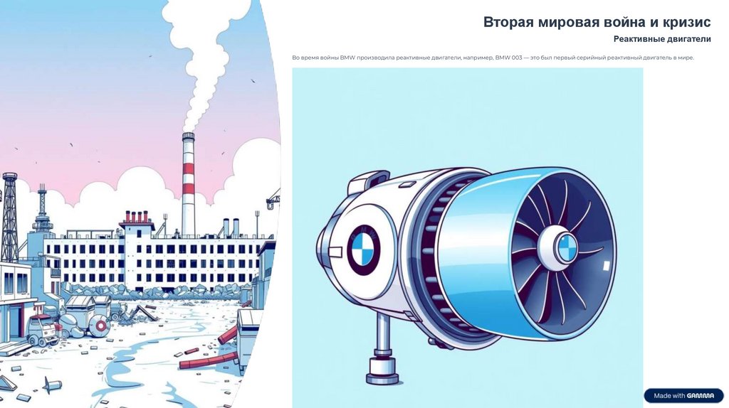 Во время войны BMW производила реактивные двигатели, например, BMW 003 — это был первый серийный реактивный двигатель в мире.