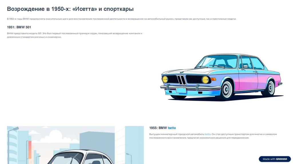 Возрождение в 1950-х: «Исетта» и спорткарыВ 1950-е годы BMW предприняла значительные шаги для восстановления послевоенной деятельности и возвращения на автомобильный рынок, представив как доступные, так и престижные модели.
