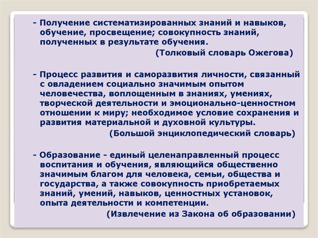 - Получение систематизированных знаний и навыков,обучение, просвещение; совокупность знаний,