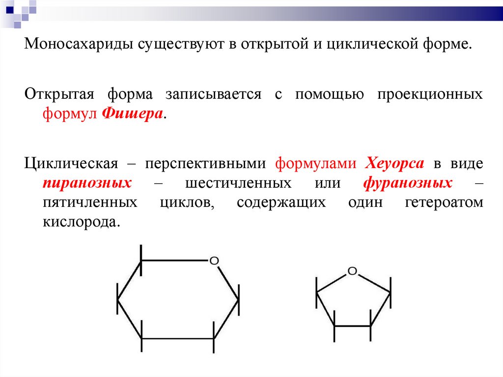 Моносахариды существуют в открытой и циклической форме.Открытая форма записывается с помощью проекционных